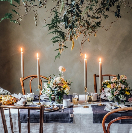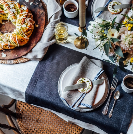 Stwórz niezapomnianą atmosferę dzięki lnianym tekstyliom Lovely Linen. Odpowiedni kolor obrusu w zestawieniu z lnianymi serwetkami tworzy elegancki kontrast, który pięknie podkreśla dekoracje stołu. Blask świec, bukiet świeżych kwiatów i smakowite wypieki idealnie dopełniają tę klimatyczną aranżację.